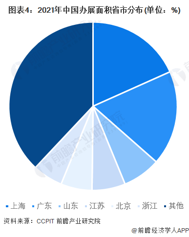 2021年,新冠肺炎疫情在我国境内已基本得到控制,因此我国各省市办展情况较2020年相比有所好转。2021年,我国办展数量前三位的省份分别为广东省、上海市和江苏在省,分别办展419场、341场和307场;分别同比上涨了47.5%、11.6%和10.4%。