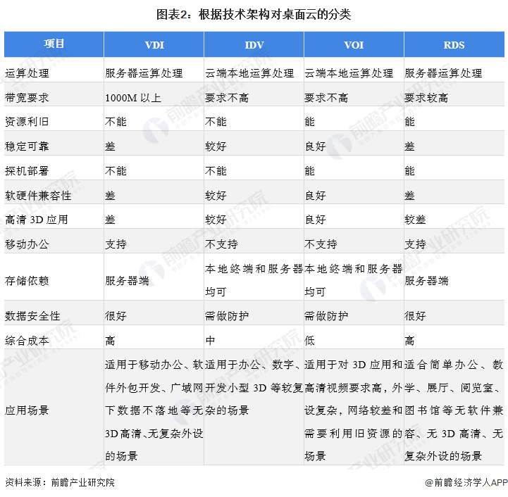 目前市面上的桌面云技术架构种类也逐渐增加,桌面云技术架构主要包括VDI(虚拟桌面基础架构)、IDV(智能桌面虚拟化)、VOl(虚拟操作系统基础架构)、RDS(共享云桌面架构)等,不同的技术架构有各自的特点和局限,适用的应用场景也各有不同,目前比较主流的技术架构为VDI和IDV,值得注意的是,为解决用户复杂环境下的虚拟化应用,融合VDI、IDV和VOI三种架构的混合架构已经出现,未来有望成为桌面云的主流架构。