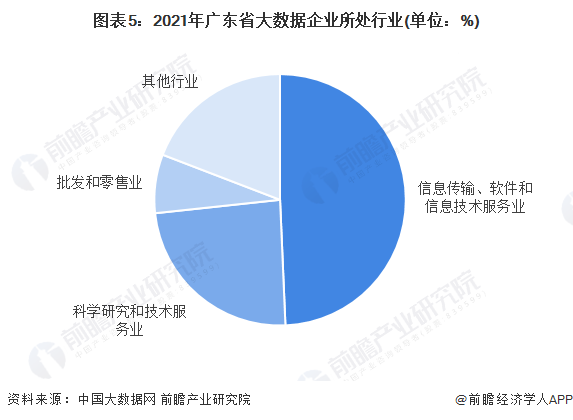 从行业分布来看,2021年广东省2745家处于健康发展阶段及以上阶段的优质大数据企业中,所处行业分布排名第一的领域为信息传输、软件和信息技术服务业,企业数量达1354家,占比近50%。