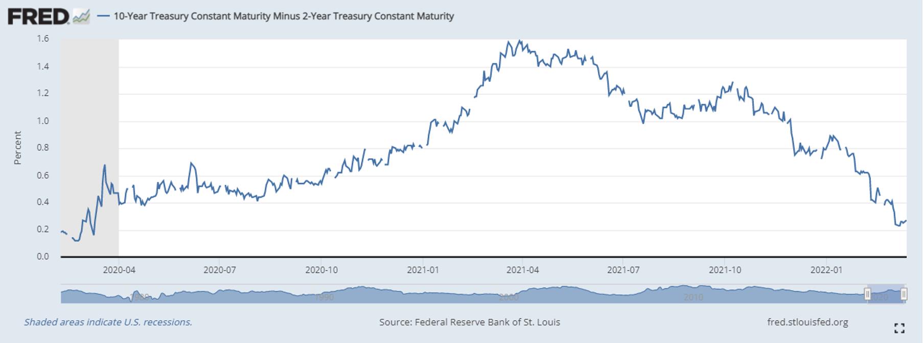 这点能够直接从股市近期的表现得以印证。从去年11月份开始,美债利差开始单边下跌,道指与纳指同时见顶开始大举回调,足以证明经济周期模型的可靠。因此投资者在“抄底”股指时,也需要着重关注长短期国债利差的方向。由于利差往往会先一步股市开始变化,因此投资者不必急于一时,可以耐心等待利差明显反弹,同时要抄底的股指形成底部形态,便是不错的入场时机。从美债收益率的历史行情来看,目前10年期与2年期的国债利差已经接近疫情开始的最低水平。虽然这不代表利差不会继续下降,或出现曲线倒挂,但足以让投资者有关注的必要。从利差长期的趋势来看,全球股市的回调最低点很可能在最近一两个月出现。