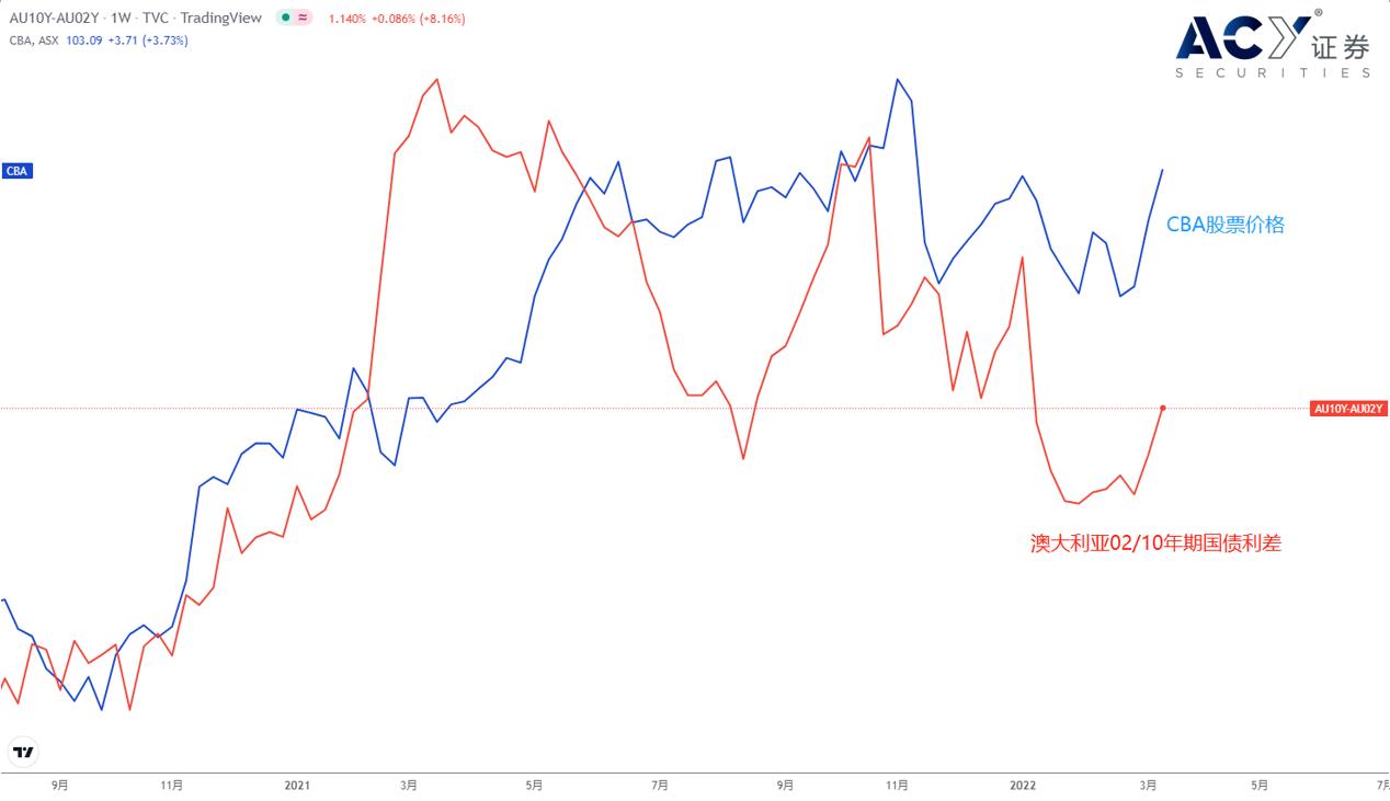 相比之下,短期的利差变化对一个国家的股指价格影响并不大,不过对银行板块却有着直接的驱动。银行的盈利来源是贷款收入与存款支出的差值,对应的便是长短期国债的利差。因此当利差开始反弹时,会直接反映在银行的股价当中。从最近澳洲最大的商业银行CBA股价表现来看,伴随近两日利差的大涨,股价也随之高开高走。考虑到今日澳联储纪要中仍体现鸽派态度,可能会持续扩大长短期国债的利差水平,因此CBA有短线做多的机会,需要关注股价突破103的多头信号,上方阻力在110关口。不过考虑到利差的整体趋势仍然向下,澳洲的银行板块并未进入长期上涨的趋势。