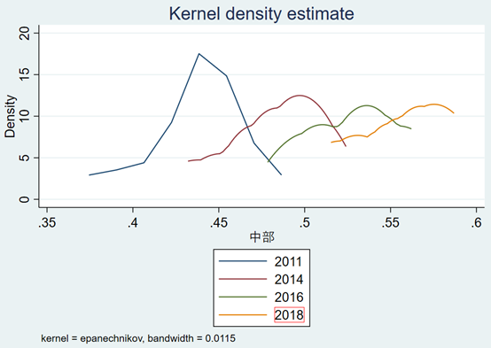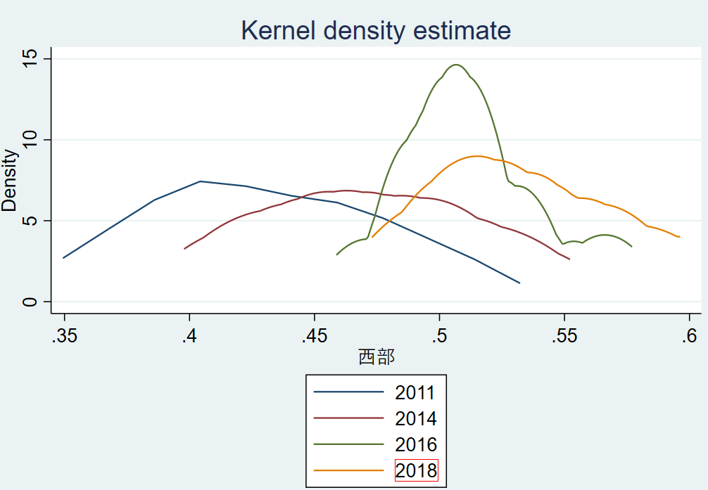 1398767274 发表于 2022-3-15 23:24 如图,我的2011年的核密度图线都不太光滑,单个2014、2016、2018年的单线也不太光滑,但是和在一起看2014/2 ...