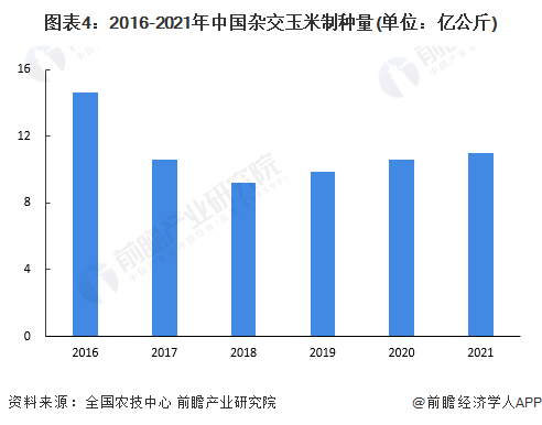 2016年起,国家取消了玉米临储政策,叠加出台“镰刀弯”地区玉米调减计划。2018年玉米制种基地灾害情况明显轻于常年,全国杂交玉米单产达到396公斤/亩,是近16年来最高水平,但由于制种面积大幅下降,新产种子总产首次低于10亿公斤,达到9.22亿公斤,创下近15年来的新低。2018-2020年,我国玉米制种量呈上升趋势,2020年,我国杂交玉米制种量为10.58亿公斤。据初步统计,2021年中国杂交玉米制种量达11亿公斤。