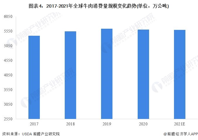 牛肉消费方面,据美国农业部(USDA)统计数据显示,2017-2019年,全球牛肉消费量呈现平稳增长的发展态势,到2020年,受疫情影响,全球牛肉流通受阻,牛肉消费整体出现小幅回落,全年牛肉总消费量5606.9万公吨,随着全球疫情的逐步控制,经USDA初步估算,2021年全球牛肉消费量为5599.4万公吨。