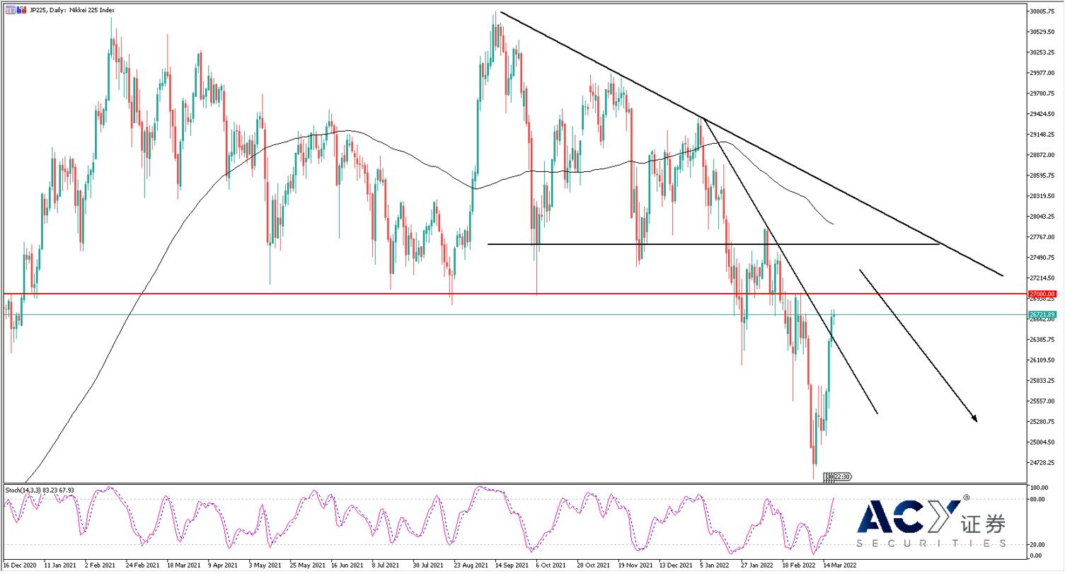 从日经指数日线图来看,伴随油价回落以及美联储加息,指数价格利空出尽大幅反弹,不过仍受到头部颈线27000位置的压制,100日均线保持向下,空头局势较为明显。考虑到上述的基本面影响,仍应选择做空日经指数。由于短线上涨趋势较强,日内仍有冲高的动力,因此交易策略以短线逢高做空为主。入场时机主要看27000-27700的下跌中继位置,入场时机关注随机指标的超买区死叉信号。现价下方的支撑则要看25000的前低点整数字元关口,以及疫情前24000的水平支撑。