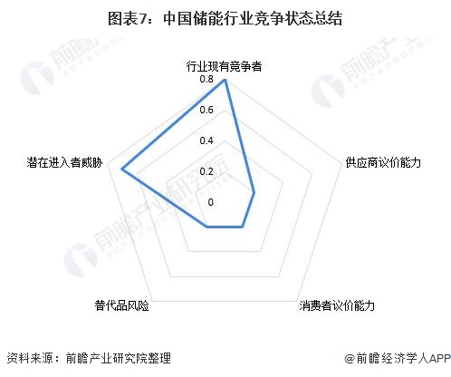 从五力竞争模型角度分析,目前,我国储能行业现有竞争者之间竞争压力较大,行业增长迅速,产业链企业纷纷进入该领域,市场竞争逐渐白热化;行业上游原材料中主要是正负极材料、电解液、隔膜等关键材料,上游供应商对储能行业的议价能力相对较弱;储能电池行业下游主要是电力、新能源汽车、家用等领域,下游消费者对储能电池行业的议价能力较弱;尽管储能行业的技术壁垒相对较高,但在进入“十四五”发展的新阶段,储能在未来我国能源体系建设中的关键地位愈发突显,行业吸引力较强。整体来看,储能行业潜在进入者威胁较大。