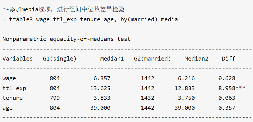 连老师的ttable3命令,进行中位数组间差异检验,回归结果的Diff是啥?肯定不是median(1)-median(2),那到底是啥呢?