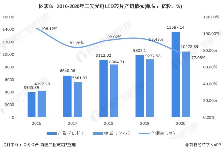 近年来,公司持续扩充LED芯片产能,LED芯片产销量不断增长。根据公司财报数据显示,2020年公司LED芯片产量为13587.14亿粒,销量为10473.39亿粒。