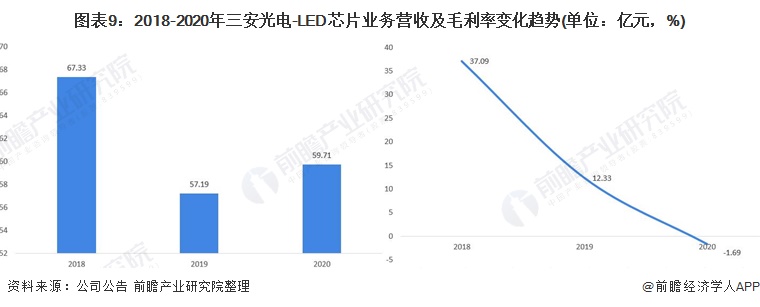 从LED芯片业务的经营情况来看,2018-2020年,三安光电的LED芯片业务收入先降后升,毛利率连续下滑。这主要是由于2019年LED芯片价格降幅较大,导致公司营收和毛利率均有所下降。2020年由于部分原辅材料价格大幅上涨,而产品价格同比降价幅度偏大,致公司整体经营情况偏弱。