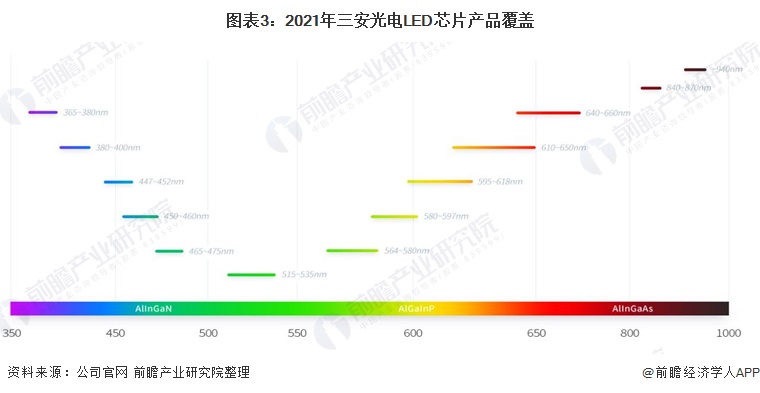 根据企业官网信息显示,三安主要从事全色系超高亮度LED芯片的研发、生产与销售,能够提供全波长范围的LED,产品可覆盖全部可见光和不可见光谱。