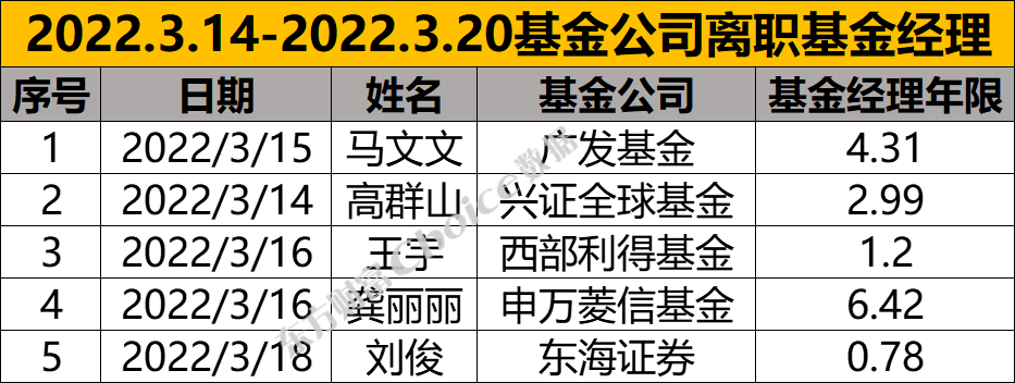 Choice数据统计显示,3月14日至3月20日之间,有5位基金经理离职,离职基金经理平均从业年限位3.14年。