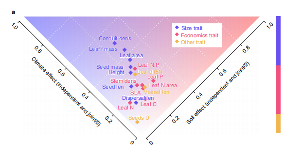 图很炫酷,但是不清楚想要说明什么问题,两个轴climate 和soil effect分别随着值的增加怎么协同作用吗?