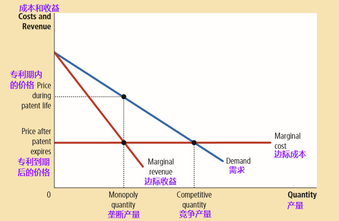 在专利期内,垄断企业通过生产边际收益等于边际成本的产量、并收取高于边际成本的价格(P>MR=MC),进而使利润最大化。