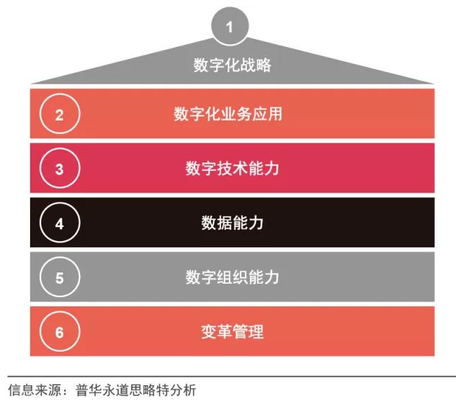 普华永道企业数字化成熟度评估框架从战略引领、业务应用结果、技术能力支撑、数据能力支撑、组织能力支撑,以及数字化变革6个维度对企业的数字化成熟度进行评估(如下图)。普华永道认为:引领性指标是第一点“数字化战略”,业务应用结果性指标是第二点“数字化业务应用”,其余4个维度(3~6)是支撑性要素,每个维度又可以细分为若干子维度。
