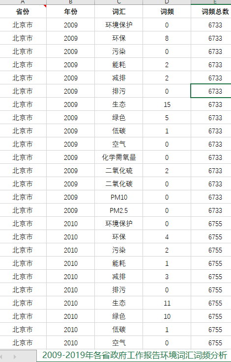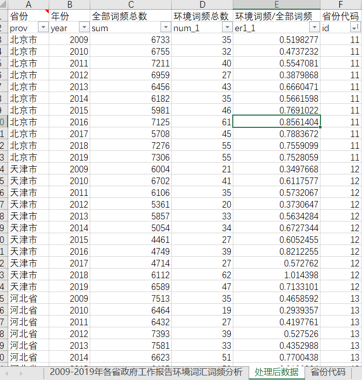 | 省份 | 年份 | 全部词频总数 | 环境词频总数 | 环境词频/全部词频 | 省份代码 |