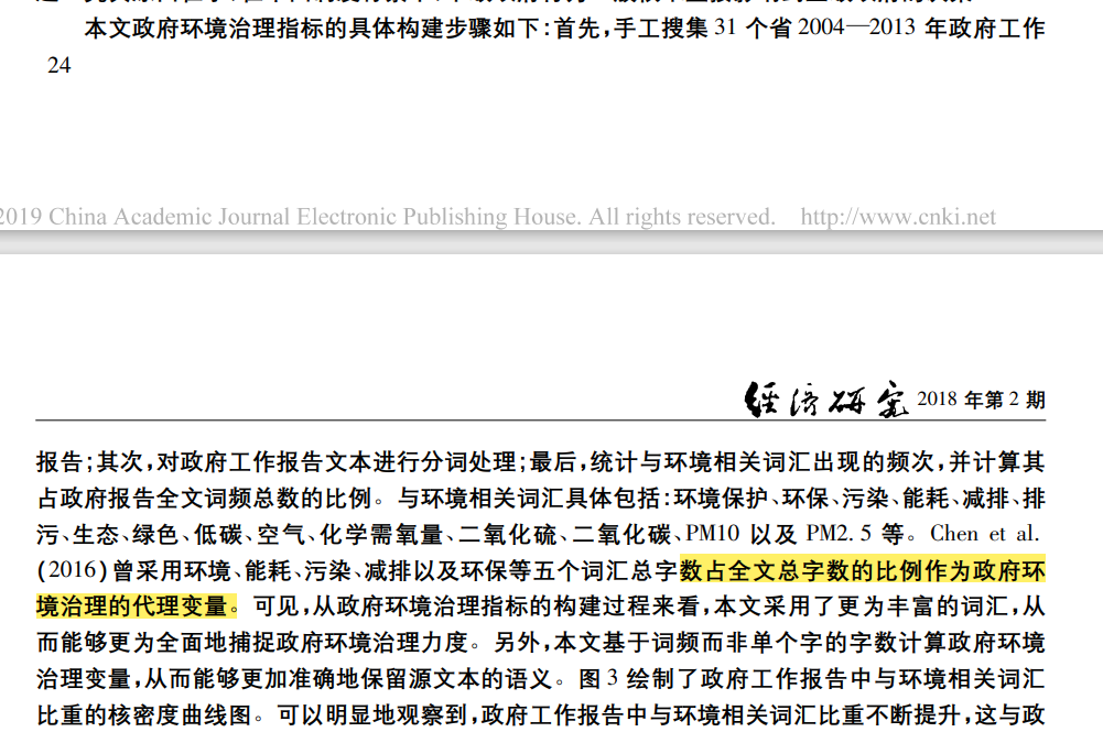 在相关文献中,环境词汇与ZF工作报告全部词频比例可以用来衡量ZF命令型/强制性环境规制。附件中是2009-2019年各省ZF工作报告环境词汇词频数据,包括31个省区,时间跨度为2009-2019年,环境词汇种类丰富,基本都包含进来了,具体见附图。此外,有具体的分每个词汇的数据还有每年汇总的数据哈,两个表格表头分别是:这里的num_1变量是我把每年各省份的全部有关环境词频汇总起来了,er1_1是环境词频/ZF工作报告全部词频,用省份代码匹配过了,方便与其他数据进行合并,文件夹里也有dta格式的数据结果哈,代码只是汇总词频的还有匹配省份代码的过程。希望可以帮助到大家。