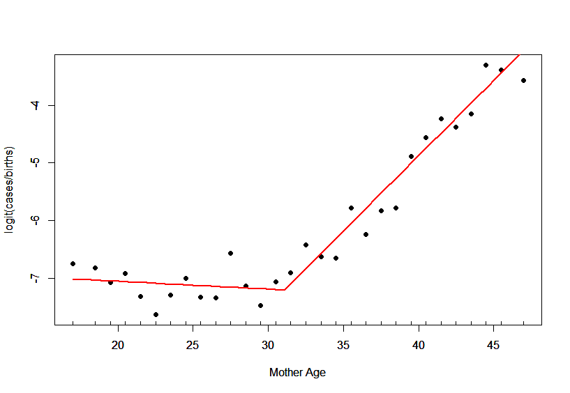 plot(down$age,log(down$cases/down$births),pch=20,cex=1.5,ylab="logit(cases/births)",xlab="Mother Age")