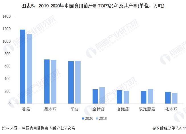 调查统计数据显示,香菇依然是2020年产量最大的品种,全年总产量为1188.21万吨,是目前仅有的总产量突破1000万吨的食用菌。具体来看,按品种统计,产量过500万吨的食用菌中,前三品种不变,其中香菇(1188.21万吨)、黑木耳(706.43万吨)、平菇(682.96万吨);金针菇以227.91万吨的产量位居第四;五六名位置互换,双孢蘑菇(202.21万吨)受产量下降影响被杏鲍菇(213.47万吨)反超;第七名仍是毛木耳,产量为189.19万吨。排在前7位的品种总产量占全年全国食用菌总产量的84%,是我国食用菌生产的常规主品种。