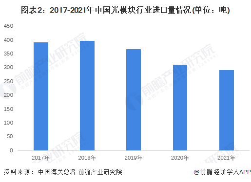 2017-2021年我国光模块行业进口量总体波动下降,2017年我国光模块行业进口量达391.7吨,2021年下降至291.0吨,下降幅度达25.71%。