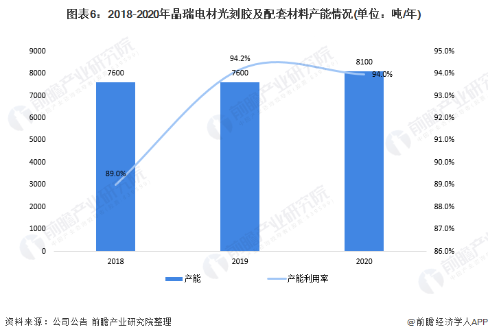 光刻胶产能方面,2018-2020年,公司光刻胶及配套材料产能总体增长,2020年设计产能达8100吨/年;同时,公司光刻胶产能利用率也较高,2018年以来均维持在90%左右。