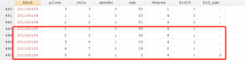 CHFS数据库中的个人层面数据库有hhid pline rela(本人与受访者关系,1本人2配偶6子女7儿媳/女婿 8孙子女),hhid+pline可以识别出唯一个体。数据库中一共有两类家庭,三代人一家(如图1,rela有12678)和两代一家(如图2,rela只有126).如何在实现将父母的受教育程度匹配到子女那一行呢?