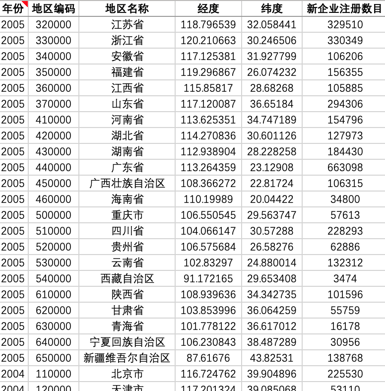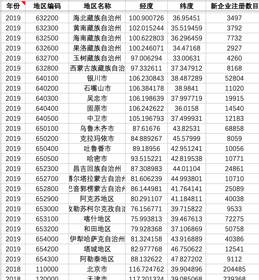 四、包含指标如下:年份、地区编码、地区名称、新企业注册数目、经度、纬度等