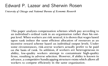 本次分享的文献是Edward P. Lazear 和 Sherwin Rosen于1981年写出,在文献中提出了锦标赛理论。本片论文为后面许多国内外学者引用,希望可以帮助到大家。