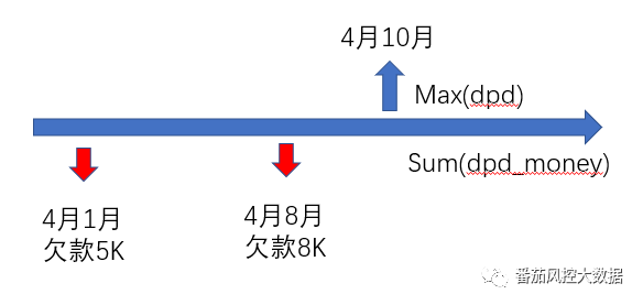 为对策略做进一步说明,列举以下实操案例供大家参考,如A客户,名下有两笔借款,假设今天为4月10日(催收日),其第一笔借款,在4月1日理应还款5k,但依旧逾期;第二笔借款,在4月8日理应还款8K,仍然未还,那在计算具体的数值时,综合计算客户A的数据后,其在4月10日的逾期为10天,逾期金额为13K,以上数值是应在系统中相关的标识。