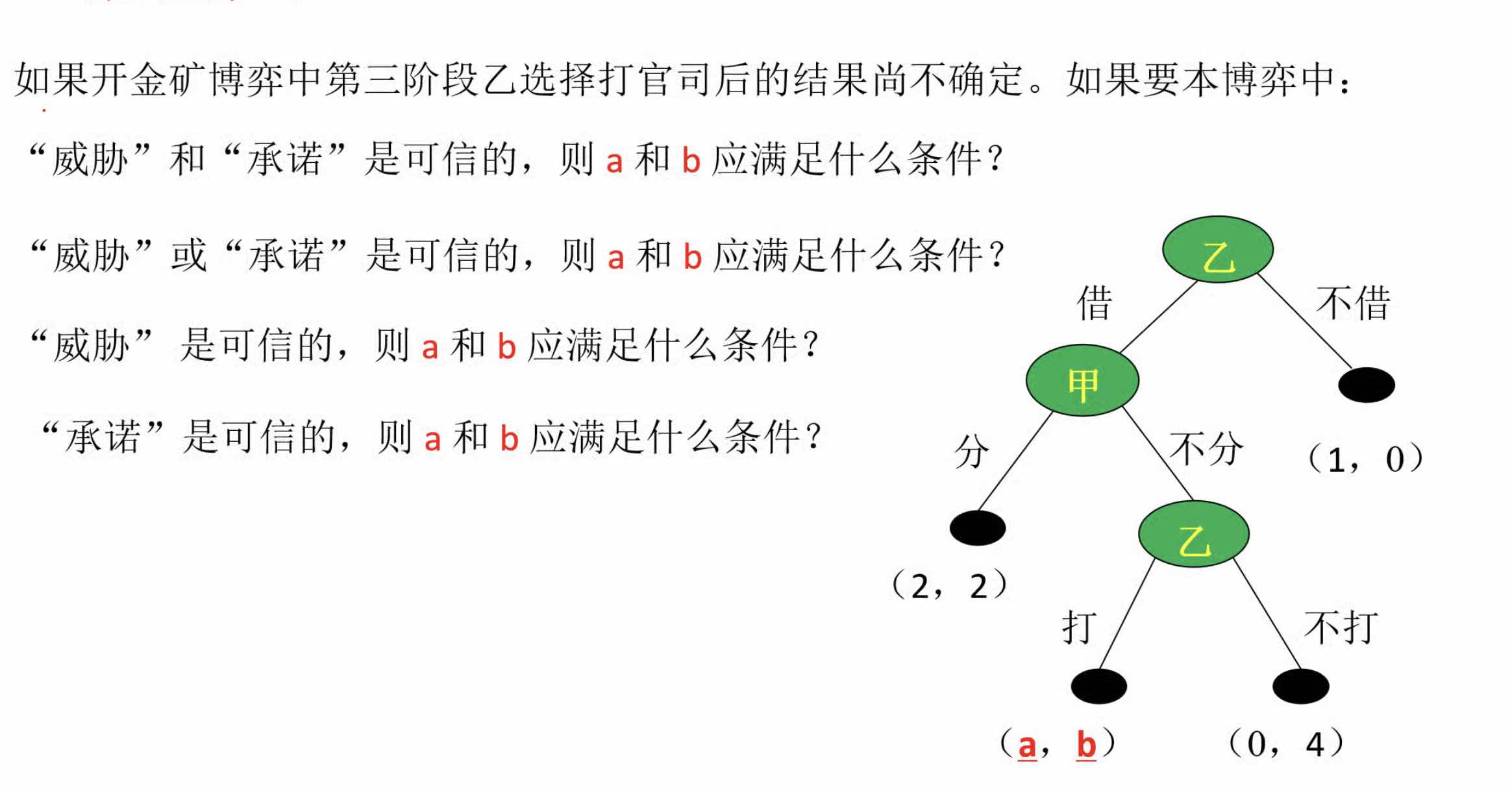我们老师在课堂上讲解为:乙的威胁如果要奏效,就必须要甲在第二阶段中的b<2,这样的配合才能让威胁生效,因为威胁必须要让甲的承诺奏效才行。并且根据分析,四道题目的解答都是a>0且b<2。