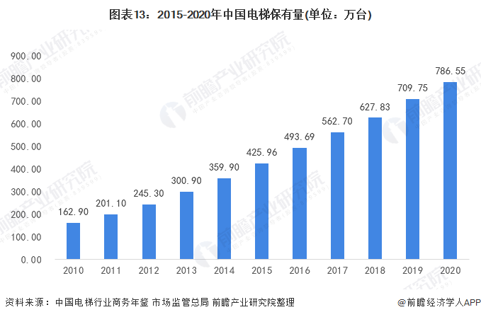 由于房地产、城市公共基础设施建设等产业发展迅速,中国新装电梯市场一直保持着高速增长,2015-2020年间,我国电梯登记数量逐年增多,2020年,我国电梯登记数量达786.55万台。