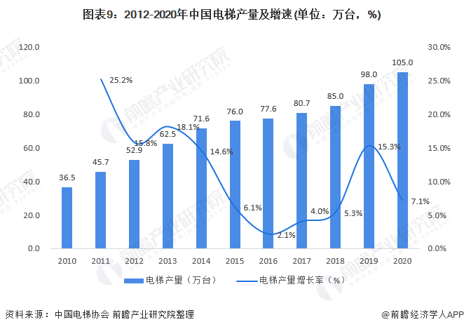 在城镇化持续发展、基础设施投资建设和旧楼加装电梯等动力推动下,电梯行业产量逐渐增多。根据中国电梯协会数据,2020年我国电梯产量达到105万台,增长7.1%。