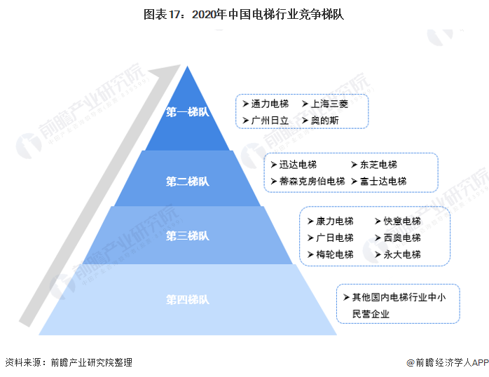综合各品牌在中国市场的研发能力、产品质量、服务水平和顾客满意度等表现,中国电梯行业竞争企业可分为四个梯队,以通力、日立以及奥的斯为代表的老牌外资电梯企业仍然领衔国内电梯市场,与上海电机的上海三菱并为第一梯队;迅达电梯、东芝电梯、蒂森电梯、富士达电梯等外资品牌的客户管理精细程度相对较弱,位于第二梯队;永大电梯、康力电梯、西奥电梯等本土电梯企业产品成为民族品牌电梯代表,发展势头强劲,位于第三梯队;其他国内电梯行业的中小企业位于第四梯队。