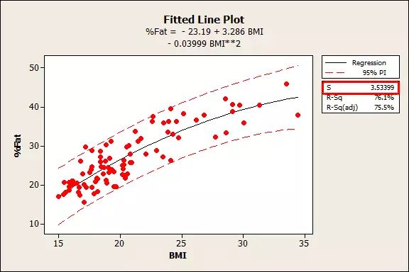 上面的图形是我以前文章中用到的拟合图,我通过体重指数(BMI)来预测身体中脂肪的百分比。S等于3.53399,这告诉我们,数据点到拟合线的平均距离即身体脂肪的比例约为3.5%。