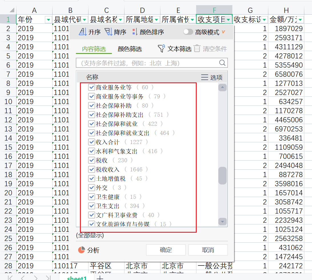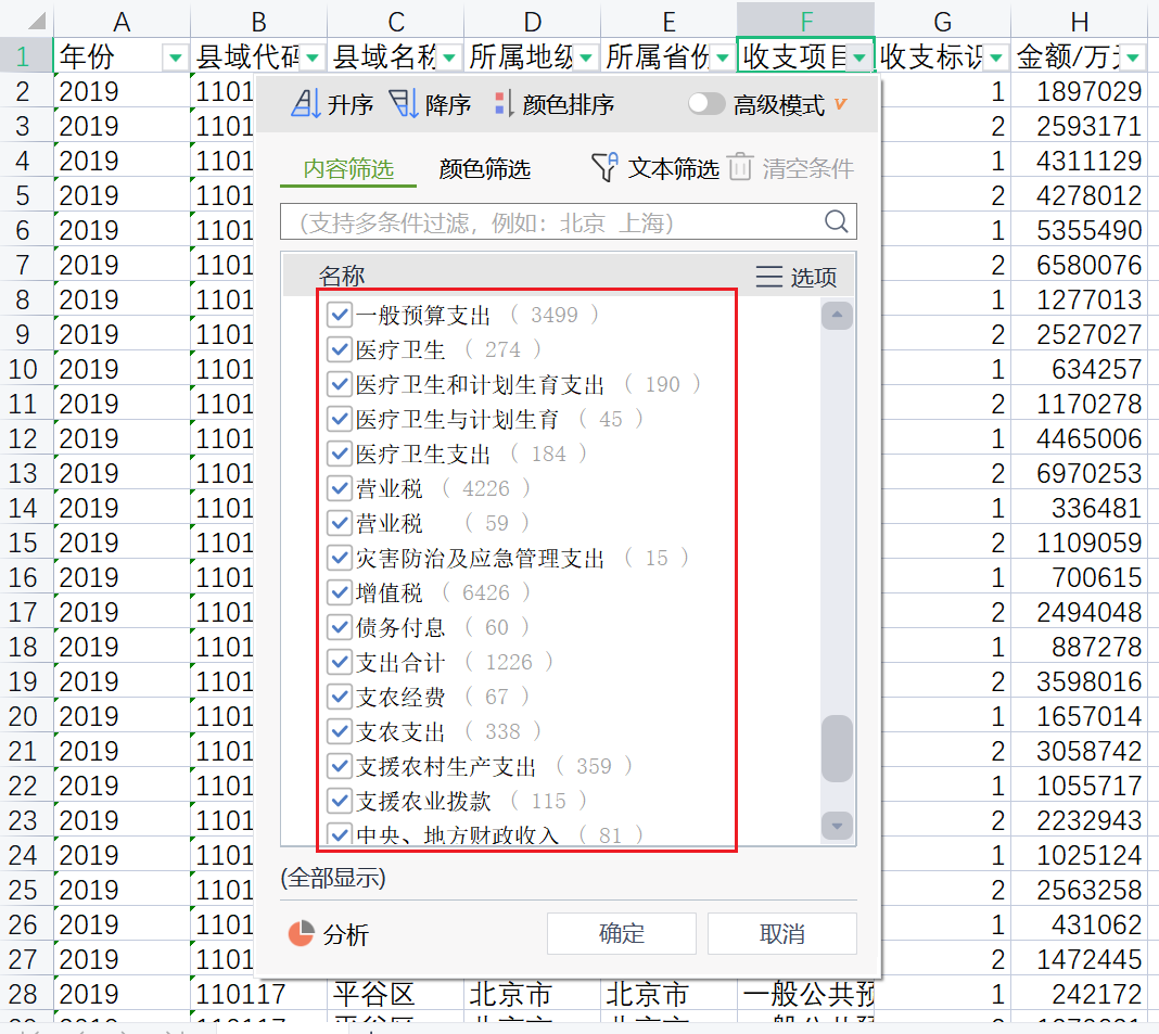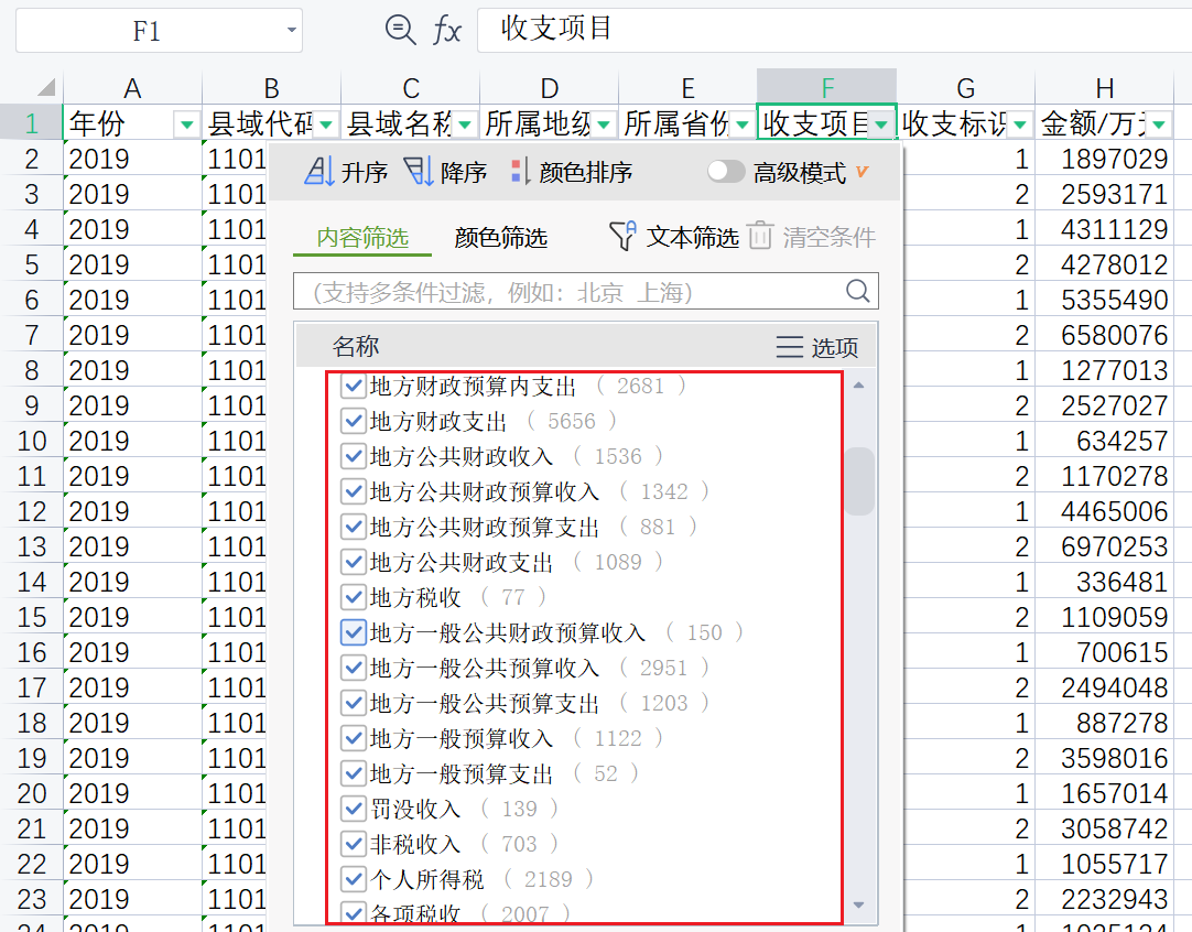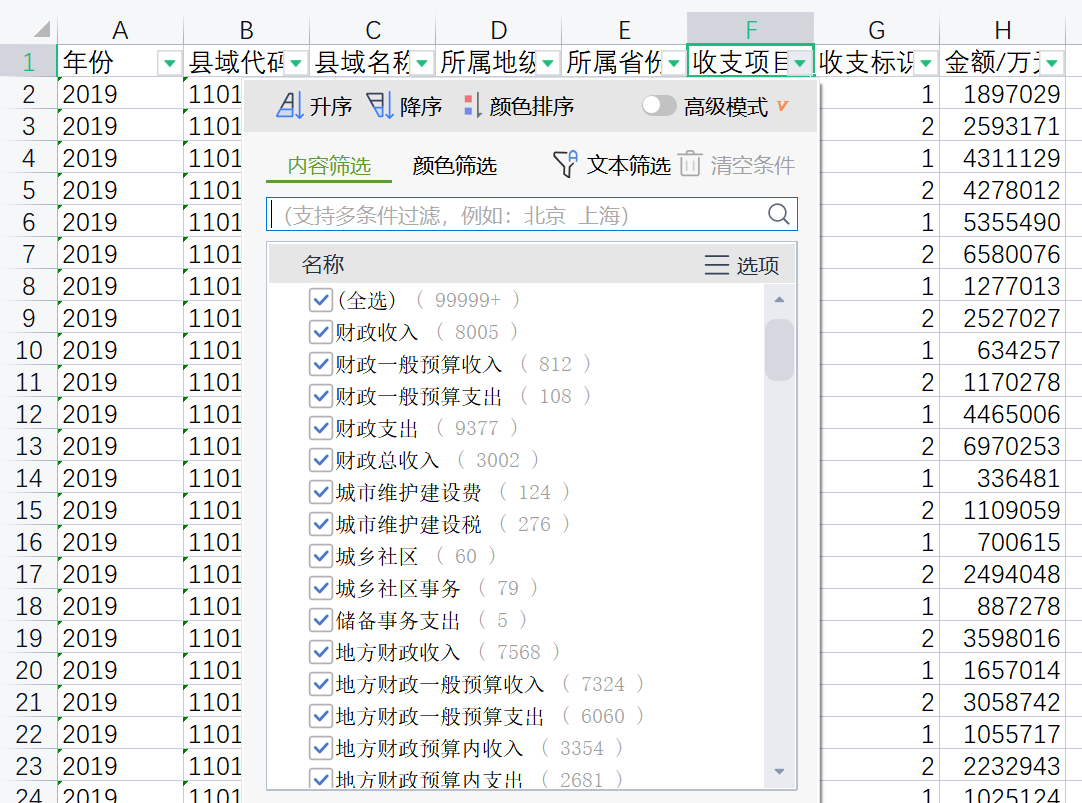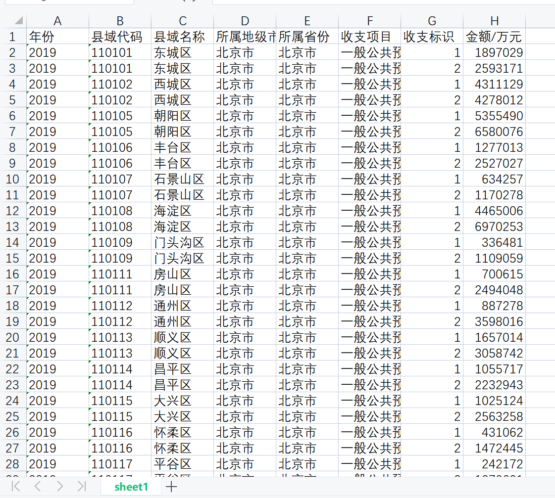指标包含:年份、县域代码、县域名称、所属地级市、所属省份、收支项目、收支标识、金额/万元