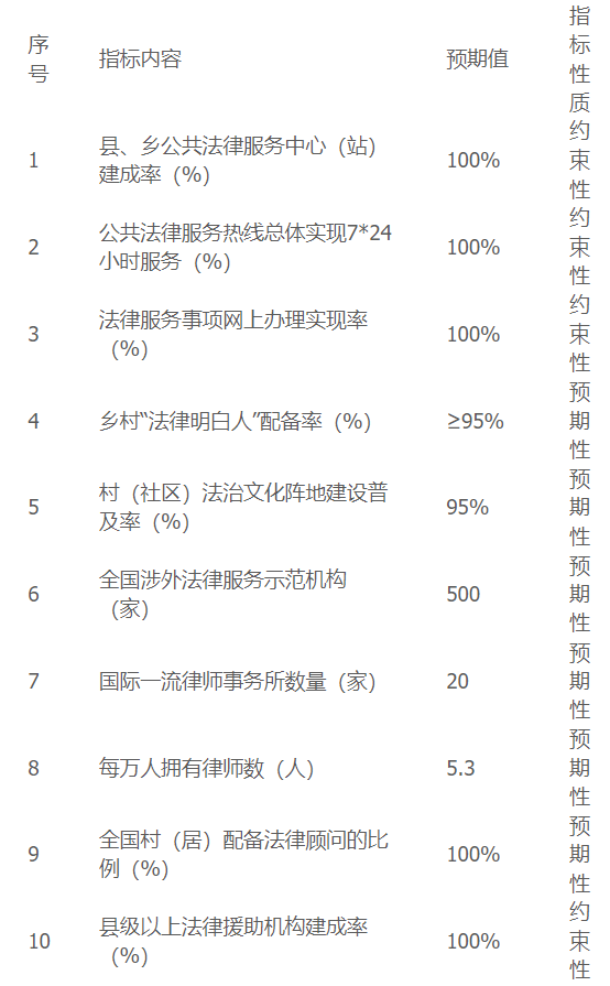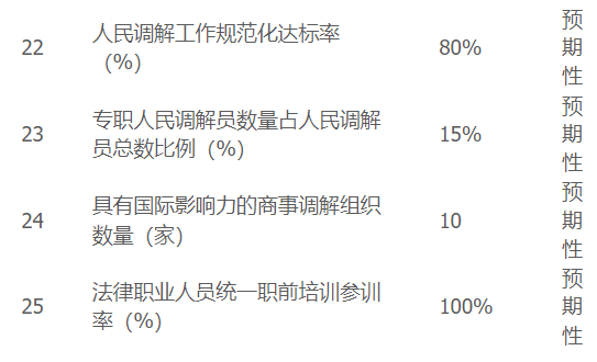 “十三五”期间,全国50万余人取得法律职业资格;到2025年,全国执业律师达到75万名;“十四五”时期公共法律服务工作主要指标:每万人拥有律师数(人)预期值:5.3;支持西安“一带一路”国际商事法律服务示范区和四川天府、福建海丝、上海虹桥国际等地建设法律服务高地,支持京津冀、长三角、粤港澳大湾区、成渝等地协调建设高水平公共法律服务中心。
