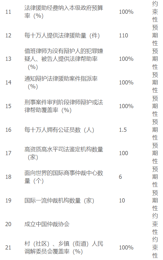 ① 建成覆盖全业务、全时空的法律服务网络。律师事务所、公证处、法律援助机构、司法鉴定机构、仲裁机构、人民调解委员会、基层法律服务所等法律服务机构设置布局合理、结构优化、有序发展。