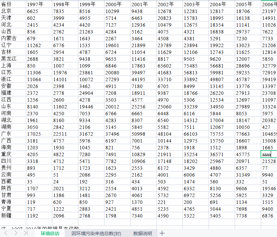 指标具体说明:各省环境污染来信总数:各省政府收到环境污染方面的人民来信总数,该数据指标可以反映出当地的环境污染问题的大体状况。