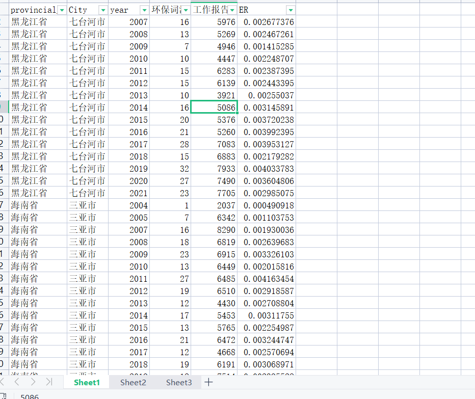 部分城市起始时间在01年之后,例如黑龙江的七台河市起始年为2007年,海南三亚市起始年份为2004年,每个城市的时间区间和具体城市名单参看下面链接内部分数据展示,链接如下:
