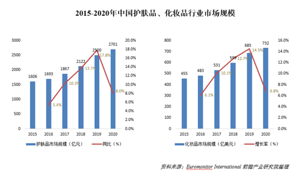 美妆产业市场规模逐年扩大。据Euromonitor统计数据,2015-2020年我国护肤品、化妆品的市场规模呈现逐年递增的趋势。2020年护肤品市场规模为2701亿元,五年复合增长率约为11%。化妆品市场规模为732亿美元,五年复合增长率约为11%。