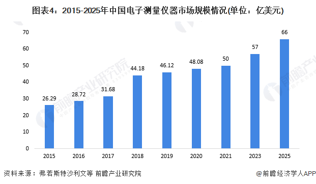 受益于中国政策的大力支持,中国的电子测量仪器市场在近几年高速增长。结合弗若斯特沙利文、ResearchAndMarkets等机构测算数据,测算2021-2025年中国电子测量仪器市场规模年复合增长率在7%左右,到2025年中国电子测量仪器市场规模将达到66亿美元左右。