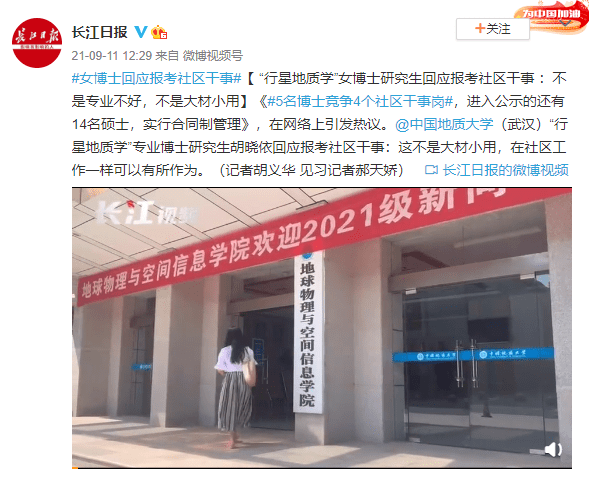 2021年9月,一位中国地质大学(武汉)行星地质学女博士报考社区干事也曾引起热议,这位博士称,想和男友留武汉发展,多尝试点其他机会。不存在浪费人才的问题,工作不分大小。