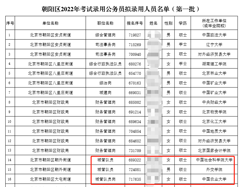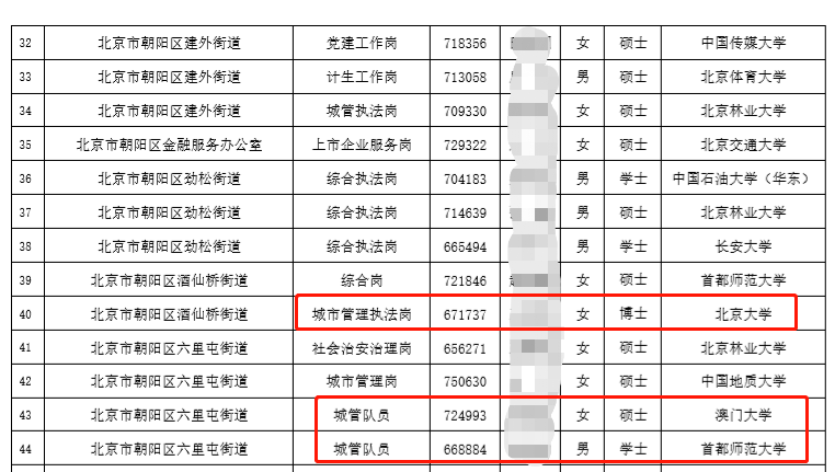 其中,朝外街道拟录用两名城管队员,分别毕业于中国社会科学院大学、外交学院;