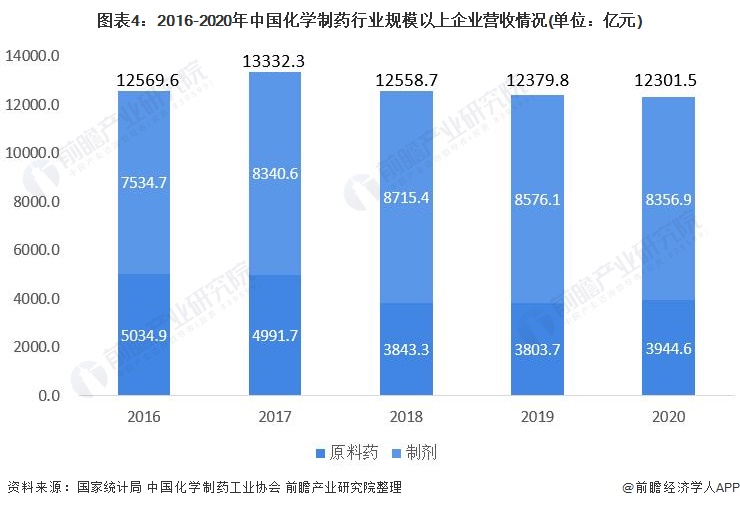 近年来随着国家出台医药行业的改革政策以来,药品价格得到有效调控,我国化学制药企业面临较大的经营压力,企业收入增速有所放缓。从化药生产企业经营情况来看,2016-2020年我国化学制药行业规上企业营收规模整体保持稳定,营收规模保持在12500亿元左右。