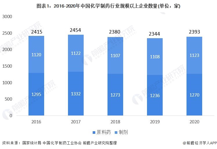 根据国家统计局数据显示,我国化药生产企业规模整体保持稳定,规上企业数量保持在2400家左右,其中原料药生产企业1270家,制剂企业1123家。