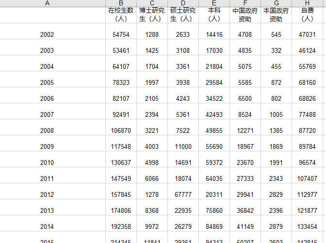 【数据说明】在校留学生数量、博士人数、硕士人数、本科人数、中国资助人数、自费人数等。有需要其他时间段或者其他指标可以联系我们进行定制
