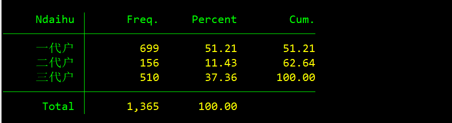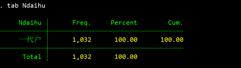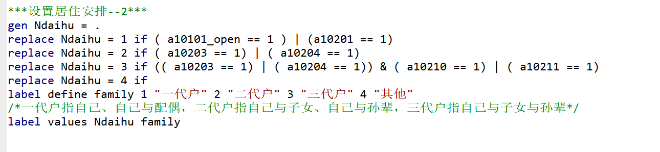 现有数据如第一张图所示,目的是按照一代户、二代户、三代户将样本分类(一代户指自己、自己与配偶,二代户指自己与子女、自己与孙辈,三代户指自己与子女与孙辈)。但是,逐步将Ndaihu = 1、Ndaihu = 2、Ndaihu = 3的命令写入,每次写入都运行时,新的运行会导致之前的样本量出现变化,请问问题出现在哪里呢?或者说stata运行这种代码的逻辑是什么?谢谢大家!