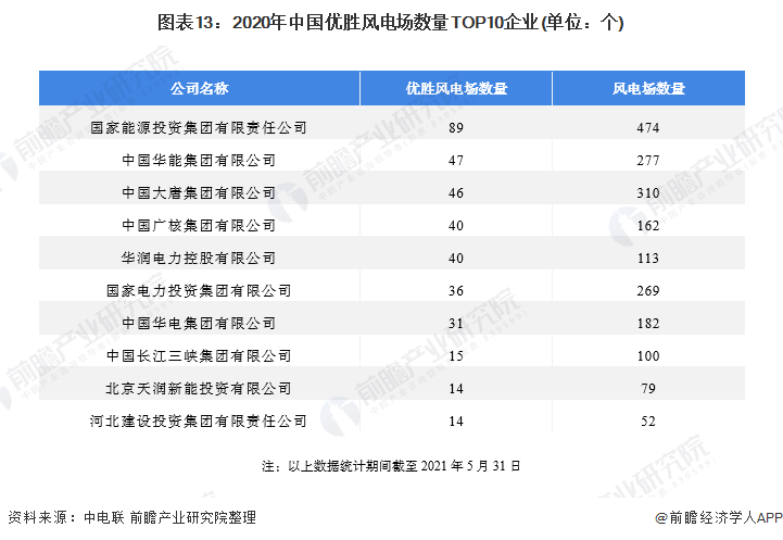 根据中电联于2021年8月公布的《关于公布2020年度电力行业风电运行指标对标结果的通知》,其中,优胜风电场数量排名前三的企业分别是国家能源投资集团有限责任公司、中国华能集团有限公司和中国大唐集团有限公司,这三家企业的优胜风电场数量都在45个以上,风电场数量也在270个以上。