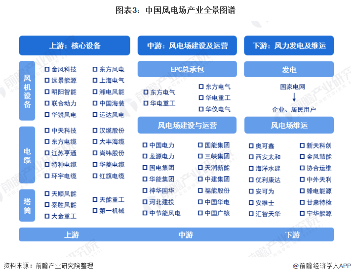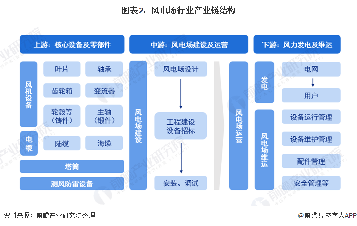 风电场产业的上游包括风电场核心设备及其零部件,即风机设备、电缆和塔筒等;中游包括风电场的建设、运营;下游主要涉及发电和风电场维运市场。