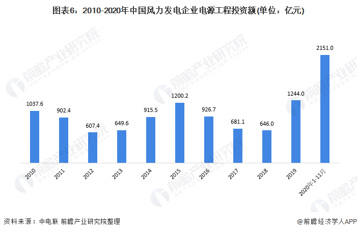 据中电联的统计数据显示,2010-2020年期间,全国风力发电工程的投资规模总体增长。2020年1-11月,全国风力发电企业电源工程完成投资额2151亿元,同比增长109.9%,是2010年以来的最大投资额。