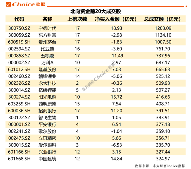 前20大成交股中,宁德时代、阳光电源、招商银行、中国建筑均获北向资金净买入10亿元以上,贵州茅台、五粮液、赣锋锂业、爱尔眼科等被净卖出。